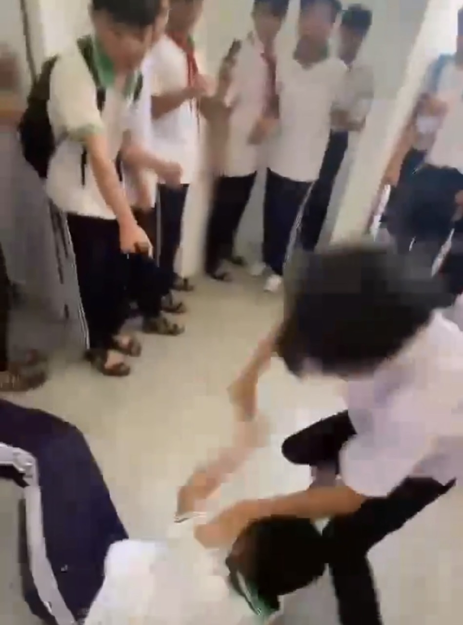 Hai trong 4 vụ học sinh Trường THCS và THPT Mỹ Quý đánh nhau. Ảnh cắt từ clip |