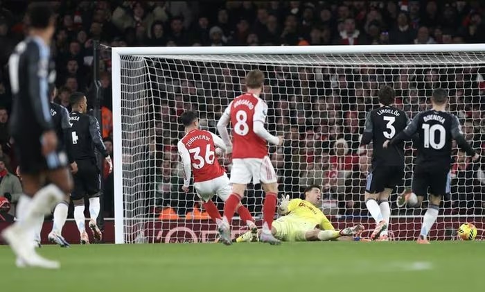 Sang hiệp 2, Arsenal nhanh chóng cụ thể hóa ưu thế. Phút 48, Bukayo Saka treo bóng từ chấm phạt góc, thủ môn Emiliano Martínez bắt không dính bóng dưới áp lực của Gabriel và trung vệ người Brazil nhanh chân đệm bóng mở tỉ số.