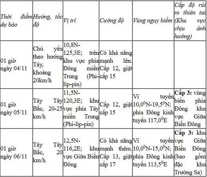 Trong các ngày 5-6/11, khu vực giữa Biển Đông (bao gồm quần đảo Trường Sa) và vùng biển ngoài khơi từ Đà Nẵng đến Khánh Hòa có khả năng chịu ảnh hưởng trực tiếp của gió mạnh cấp 12-14, giật trên cấp 17; sóng cao 8,0-10,0 m, biển động dữ dội.
