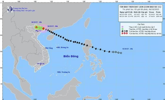 Bản đồ dự báo quỹ đạo và cường độ bão số 11 phát lúc 5 giờ ngày 6/10. |