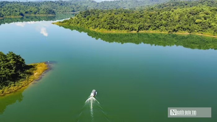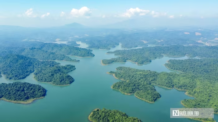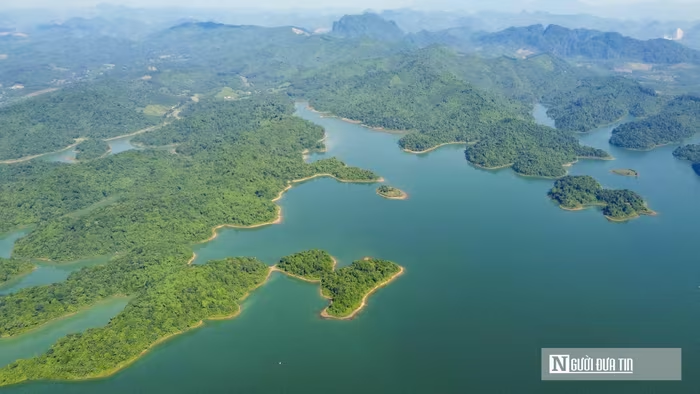 Giữa cái nắng đầu hè, mặt hồ Sông Mực xanh thẳm mở ra như một tấm gương khổng lồ giữa đại ngàn. Gió từ lòng hồ thổi rào rạt, xua tan oi bức, mang theo hơi nước mát lành lan khắp những triền cỏ ven bờ. Những hòn đảo lớn nhỏ nhấp nhô giữa làn nước, tạo nên khung cảnh được ví như "Hạ Long trên cạn" của Thanh Hóa. |