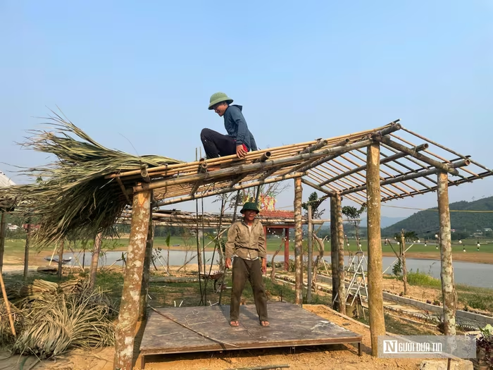 Giữa không gian ấy, anh Lê Văn Niên (36 tuổi, thôn Cây Nghia, xã Xuân Thái) đang tất bật hoàn thiện những lều trại lợp lá cọ ven hồ để kịp đón khách dịp nghỉ lễ 30/4."Hiện đã có 8 đoàn khách đăng ký, dự kiến sẽ còn tăng khi gần đến kỳ nghỉ", anh Niên nói. |