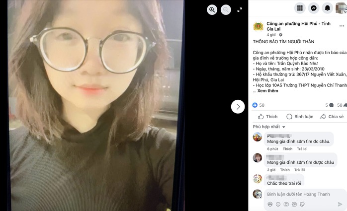 Ngày 20-10, Công an phường Hội Phú, tỉnh Gia Lai đã phát đi thông báo tìm em Trần Quỳnh Bảo Như (SN 2010, học sinh lớp 10, Trường THPT Nguyễn Chí Thanh, phường Hội Phú) mất tích sau khi đi học.