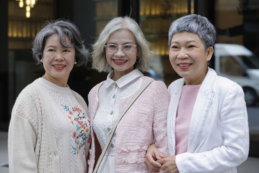 Chị Phạm Lệ Điệp (ngoài cùng, bên phải) tự tin với mái tóc bạc tự nhiên |