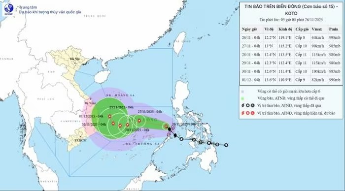 Thông tin từ Trung tâm dự báo khí tượng thủy văn Quốc gia, bão số 15 đã đi vào Biển Đông. Hồi 4h ngày 26/11, vị trí tâm bão ở vào khoảng 12,2 độ Vĩ Bắc; 119,1 độ Kinh Đông, cách đảo Song Tử Tây khoảng 540km về phía Đông. Sức gió mạnh nhất vùng gần tâm bão mạnh cấp 8 (62-74km/giờ), giật cấp 10. Di chuyển theo hướng Tây Bắc với tốc độ 20-25km/h.