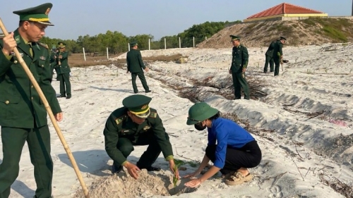 Chiến sĩ Biên phòng và đoàn viên tham gia trồng cây trên vùng cát ven biển Quảng Trị. |