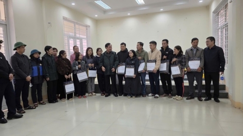 Thứ trưởng Võ Văn Hưng trao quà của Bộ Nông nghiệp và Môi trường cho 11 hộ dân bị sạt lở tại xã Khe Sanh, tỉnh Quảng Trị. |