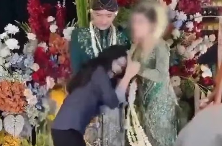 Khi người phụ nữ cúi xuống hôn tay chú rể, cô dâu phản ứng ngay lập tức và dứt khoát bằng cách nắm chặt lấy tay người phụ nữ, giật tóc và kéo cô ta ra xa.