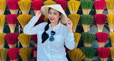 Mỹ nhân ảnh lịch một thời chọn phong cách kín đáo với áo dài gấm họa tiết và vấn khăn sắc màu.