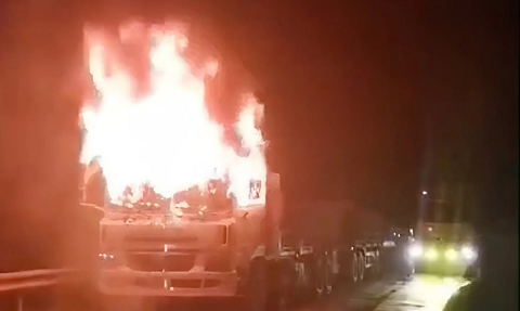 VIDEO: Xe đầu kéo biển số nước ngoài cháy ngùn ngụt trong đêm