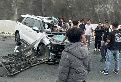 Cú tông mạnh vào xe hút rác trên cao tốc Móng Cái - Hải Phòng khiến xe 7 chỗ hư hỏng nặng, kính chắn gió vỡ vụn.