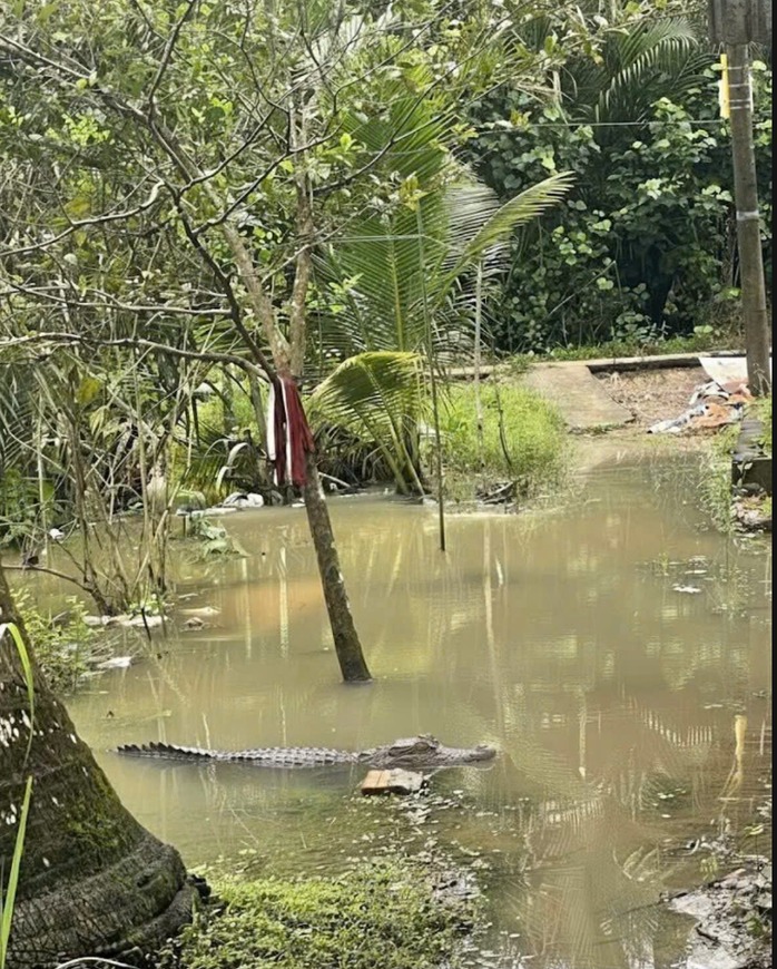 Hình ảnh con cá sấu nổi trên mặt nước gần vách nhà được người dân chụp lại |