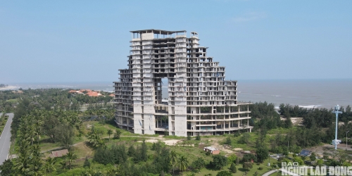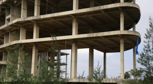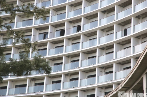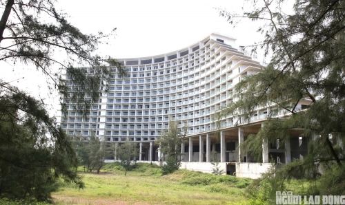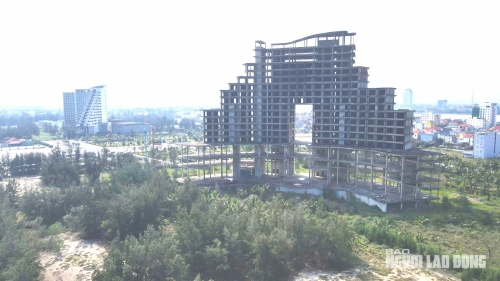 Phần thô công trình của khách sạn đã hoàn thành nhưng không được bảo dưỡng, có dấu hiệu xuống cấp. |
