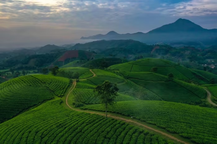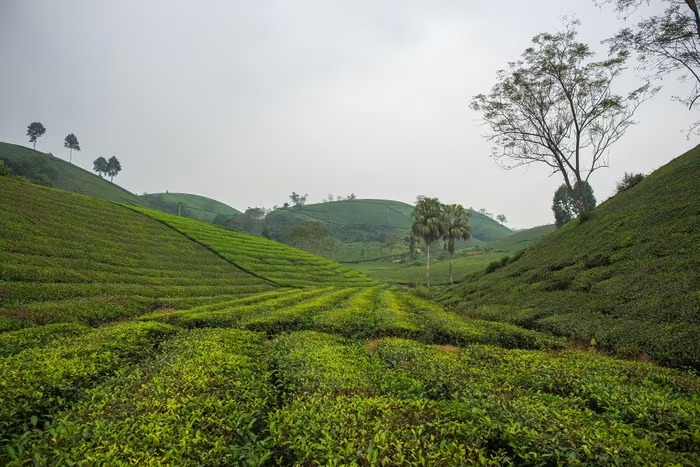 Hàng trăm ngọn đồi chè nằm xếp lớp san sát nhau, ở giữa là các lối mòn phục vụ việc đi lại, thu hái chè của người dân. Trên một số lối mòn quanh đồi, người dân trồng cây lớn có tán rộng để làm chỗ nghỉ ngơi khi đi thu hoạch chè. |