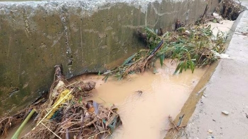 Nhiều cửa thoát nước bị rác, bùn đất lấp kín không thể thoát nước khiến ngầm tràn Ván Ri bị ách tắc. Cầu tạm của doanh nghiệp điện gió cản trở dòng chảy |