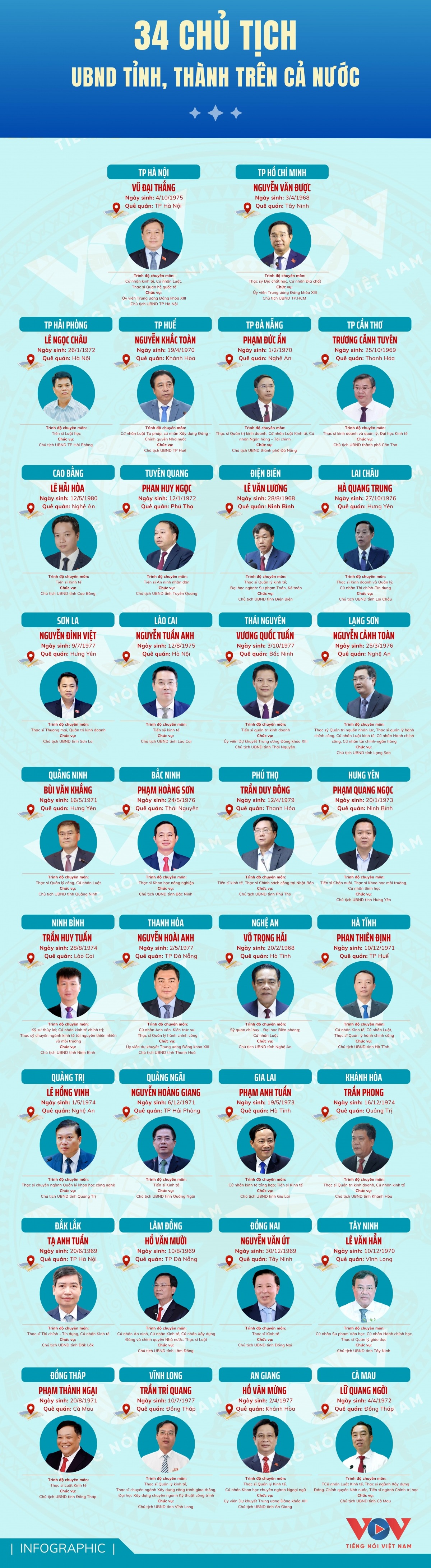 Đến nay, 34 Chủ tịch UBND tỉnh, thành phố trên cả nước nhiệm kỳ 2021-2026 đã được kiện toàn, người trẻ nhất sinh năm 1980.