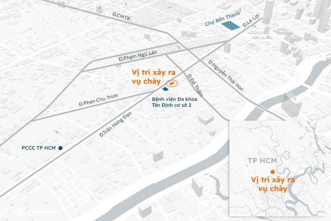 Vị trí quán ăn bị cháy trên đường Trần Hưng Đạo, quận 1 cũ. Đồ họa: Hoàng Khánh |