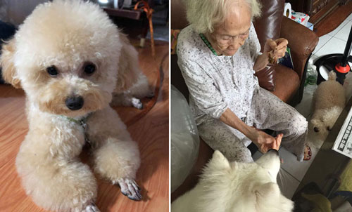 Chú chó nhỏ tên Ốc Tiêu được bà chăm sóc từ khi mới sinh nên rất quấn bà. |