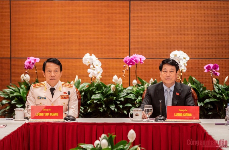 Chủ tịch nước Lương Cường và Bộ trưởng Lương Tam Quang dự buổi làm việc tại Đoàn đại biểu Đảng bộ Công an Trung ương. |