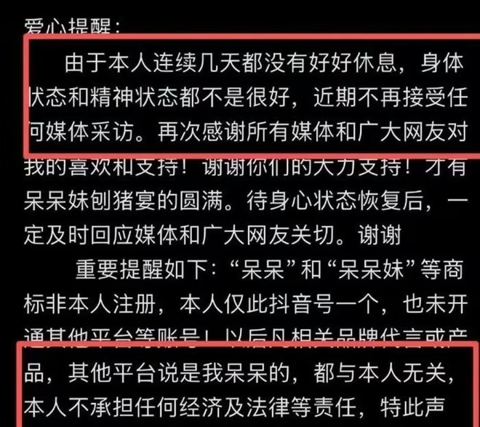 Trong tuyên bố, cô nói mấy ngày qua quay cuồng, hai ngày chỉ ngủ bốn tiếng, cả thể xác lẫn tinh thần đều kiệt sức, chỉ muốn quay về cuộc sống yên ổn. Đồng thời cảnh báo cư dân mạng rằng cô chỉ có một tài khoản Douyin, các nền tảng khác đều là giả, mọi người cẩn thận kẻo bị lừa.