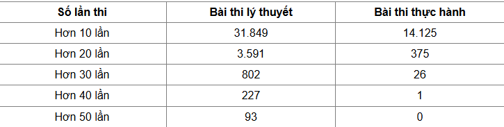 Thực tế cho thấy, không phải ai cũng gặp khó khăn như những trường hợp đặc biệt nêu trên. Tuy nhiên, dữ liệu về số người thi lại nhiều lần cũng đủ khiến nhiều người phải suy ngẫm về độ khó của bài kiểm tra. Dưới đây là bảng thống kê số lượng người thi trượt hơn 10 lần đối với cả hai phần lý thuyết và thực hành:
