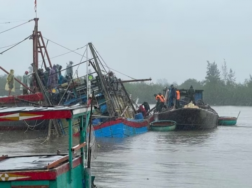 Tiếp nhận thông tin, Đồn Biên phòng Triệu Vân lập tức huy động 1 tổ công tác gồm 10 cán bộ, chiến sĩ tiếp cận hiện trường, phối hợp lực lượng chức năng và người dân địa phương triển khai biện pháp cứu hộ. Lực lượng cứu hộ đã kéo tàu lên khỏi vị trí chìm, gia cố an toàn, ngăn chặn nguy cơ chìm hoàn toàn.