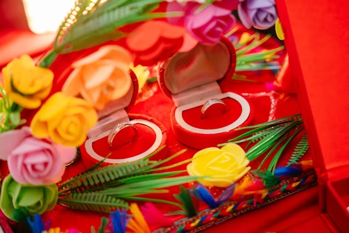 Trong lễ cưới, ngoài các nghi thức truyền thống Việt Nam, gia đình chồng cũng mang đến một nét đặc trưng của Ấn Độ: mẹ chồng chấm lên trán cô dâu chú rể một dấu tika màu đỏ - biểu tượng chúc phúc trong những dịp trọng đại.
