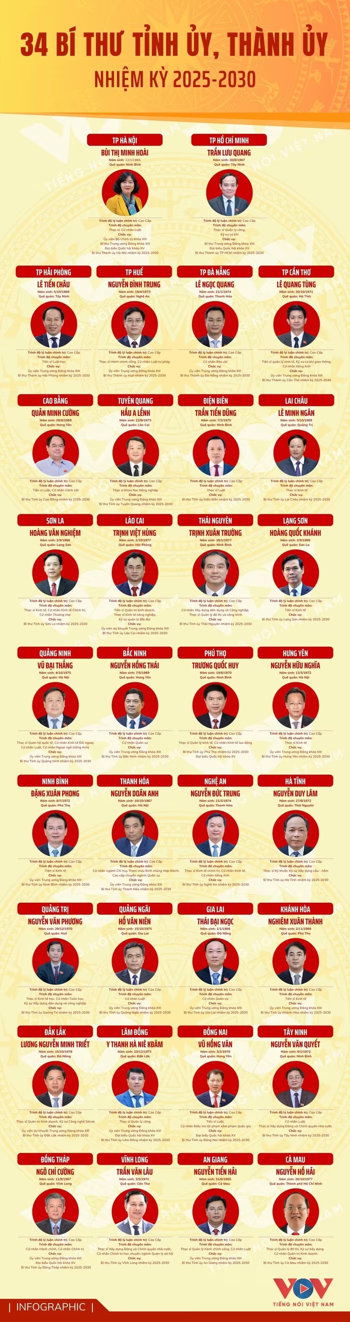 Tác giả: Quỳnh Trang - Đồng ToànNguồn tin: Báo VOV Từ khóa: Đại hội đại biểu Đảng , nhiệm kỳ 2025-2030 , Bí thư tỉnh ủy , Bí thư Thành ủy