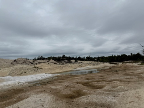 Tuy nhiên, ghi nhận thực tế cho thấy nhiều khu vực sau khai thác vẫn chưa được cải tạo. Các bãi cát trắng tiếp tục phơi mình dưới nắng gió, trong khi những hố sâu vẫn tồn tại, tiềm ẩn nguy cơ mất an toàn.