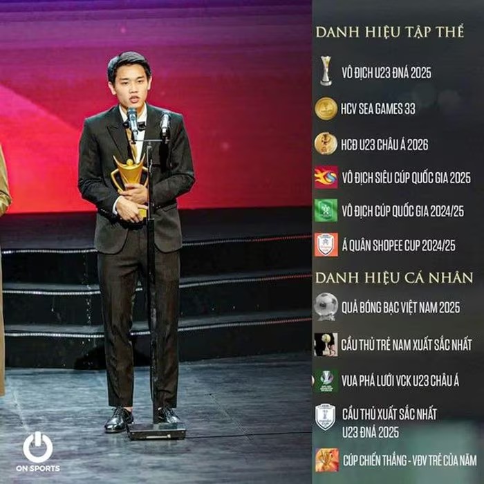 Danh hiệu cấp Đội tuyển (U22/U23 Việt Nam) Vô địch U23 Đông Nam Á 2025: Lên ngôi thuyết phục sau khi đánh bại nhiều đối thủ mạnh trong khu vực. Huy chương Vàng SEA Games 33 (2025): Tấm HCV quý giá trên đất Thái Lan, khẳng định vị thế số 1 khu vực. Huy chương Đồng U23 Châu Á 2026: Thành tích lịch sử vừa đạt được vào tháng 1/2026 sau khi đánh bại U23 Hàn Quốc ở trận tranh hạng Ba. Danh hiệu cấp Câu lạc bộ (CLB Công an Hà Nội) Vô địch Cúp Quốc gia 2024/25. Vô địch Siêu cúp Quốc gia 2025. Á quân Shopee Cup (ASEAN Club Championship) 2024/25: Một bước tiến đáng kể ở sân chơi khu vực dành cho CLB. Danh hiệu cá nhân Vua phá lưới U23 Châu Á 2026: Ghi 4 bàn thắng, trở thành cầu thủ Việt Nam đầu tiên đạt danh hiệu này ở cấp độ châu lục. VĐV trẻ của năm tại Cúp Chiến thắng 2025: Giải thưởng "Oscar thể thao Việt Nam" vừa được trao tối 29/01/2026. Quả bóng Bạc Việt Nam 2025: Lần đầu tiên lọt vào top 3 cầu thủ xuất sắc nhất năm. Cầu thủ xuất sắc nhất giải U23 Đông Nam Á 2025. Hình ảnh/Khoảnh khắc ấn tượng của năm 2025: Khoảnh khắc đội mũ cối cho HLV Kim Sang-sik (trao giải tại Gala Cúp Chiến thắng). |