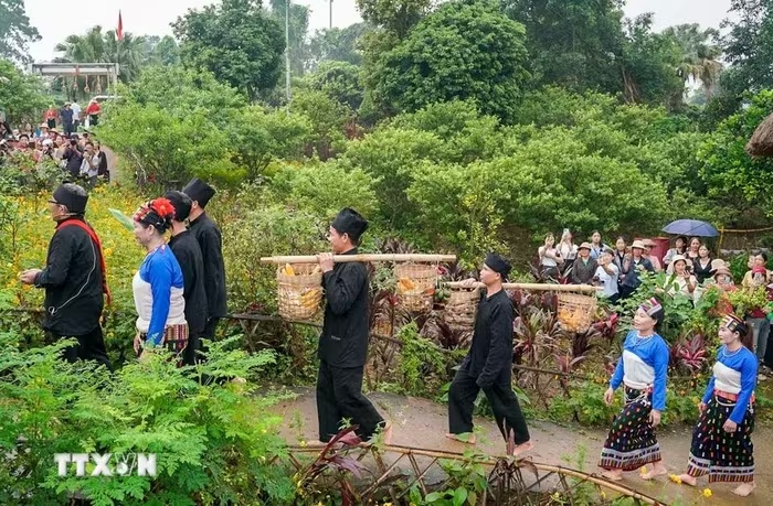 Đi đầu đoàn nhà trai là ông Mơ, tay nâng mâm trầu cau - sính lễ thiêng liêng mở đầu cho câu chuyện trăm năm, theo sau là chú rể cùng gia đình mang theo lễ vật sang nhà gái xin cưới. (Ảnh: Khánh Hòa/TTXVN) |