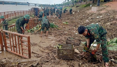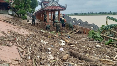 Cán bộ, chiến sĩ Ban Chỉ huy Phòng thủ Khu vực 4-Triệu Phong dọn dẹp rác và bùn tại Bến thả hoa bờ nam sông Thạch Hãn. |