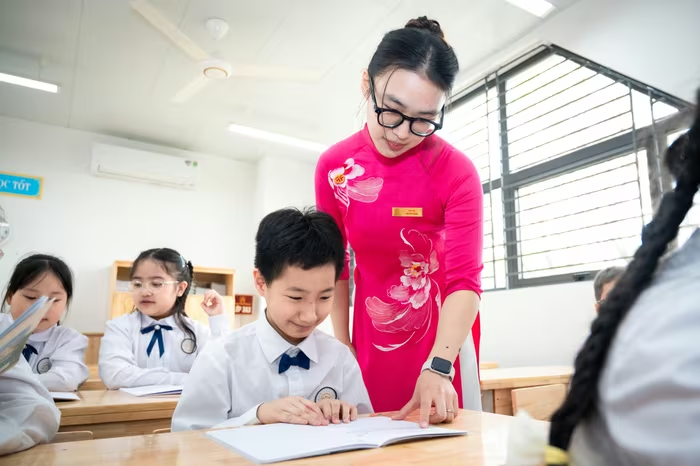 Cô trò trường Tiểu học Hoàng Mai (Hà Nội). Ảnh minh họa: Đinh Hà. |