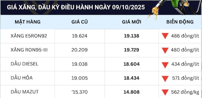 Cơ quan điều hành liên bộ quyết định xăng E5RON92 giảm 486 đồng/lít so với giá cơ sở hiện hành, về 19.138 đồng/lít; xăng RON95-III giảm 480 đồng/lít, về 19.729 đồng/lít.