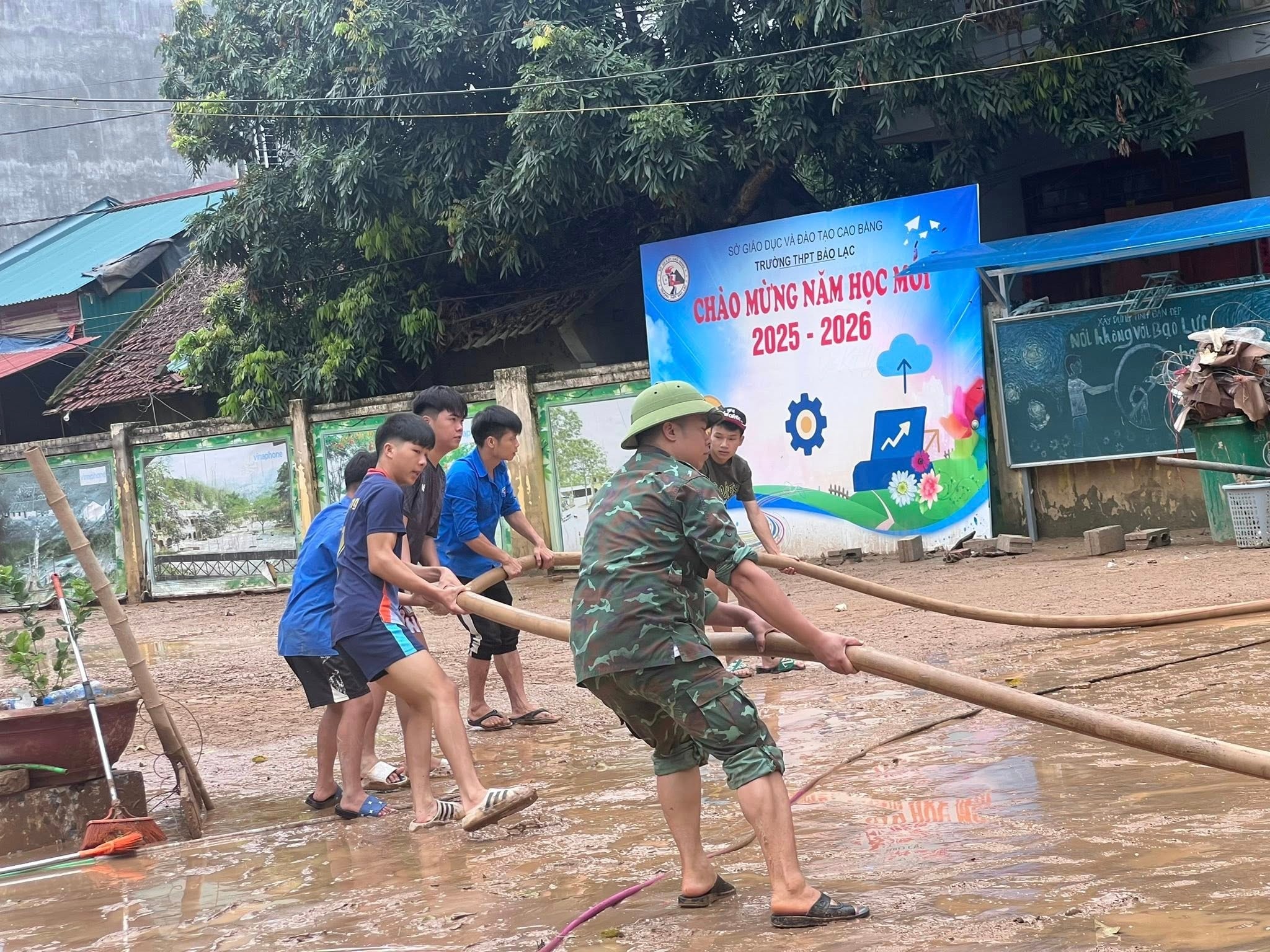Học sinh trường THPT Bảo Lạc cùng bộ đội dọn dẹp trường lớp sau bão |