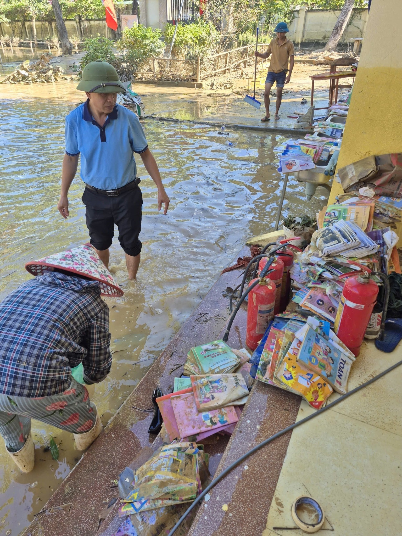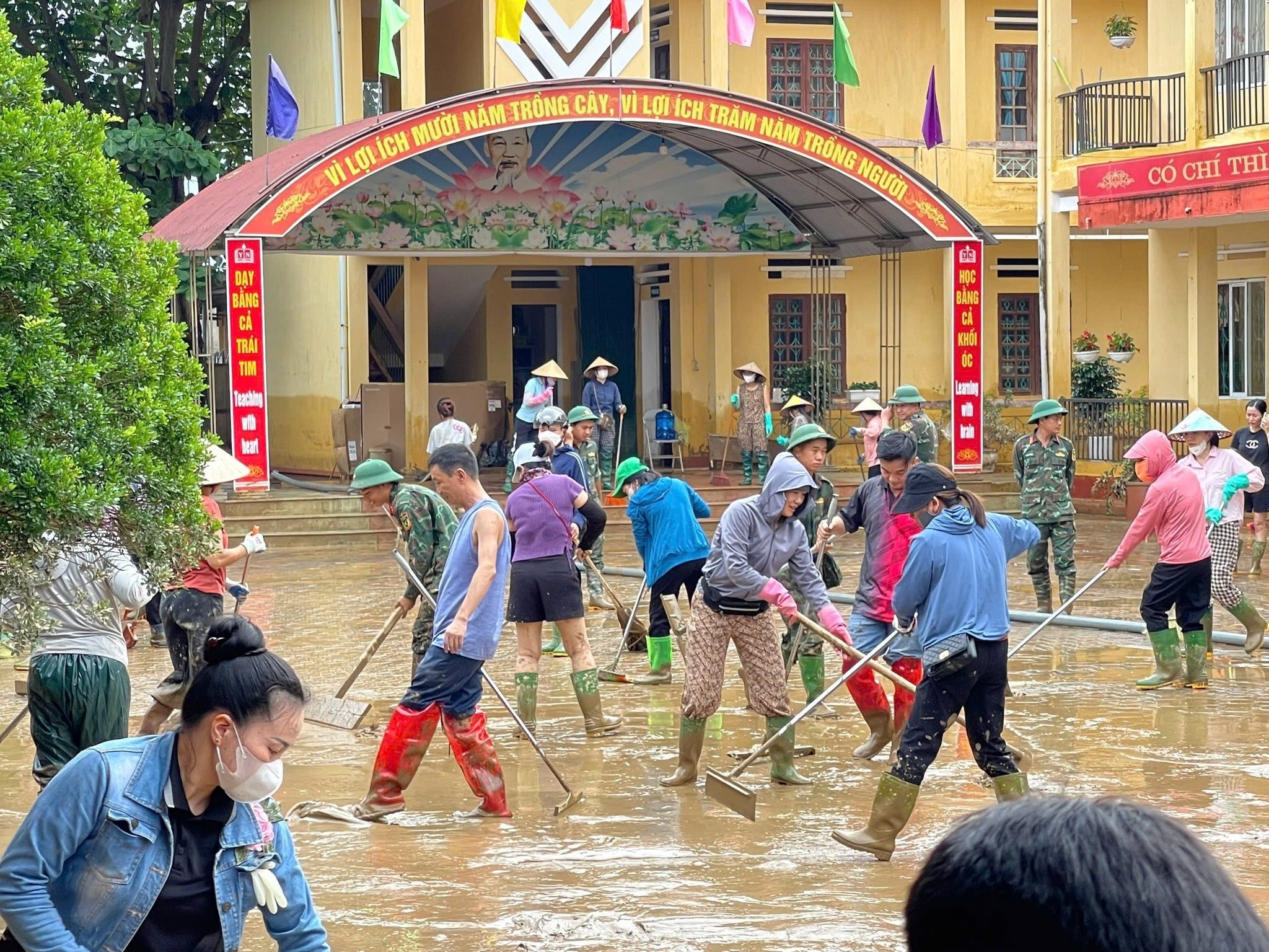 Cơn bão qua đi, sân trường, hành lang và từng phòng học hiện lên màu nâu sẫm của bùn đất. Để “giữ lửa” học đường, các thầy cô giáo, lực lượng công an, quân đội cùng phụ huynh, học sinh chung tay dọn bùn, làm sạch trường học để việc dạy – học không bị gián đoạn, học sinh nhanh chóng trở lại trường lớp.