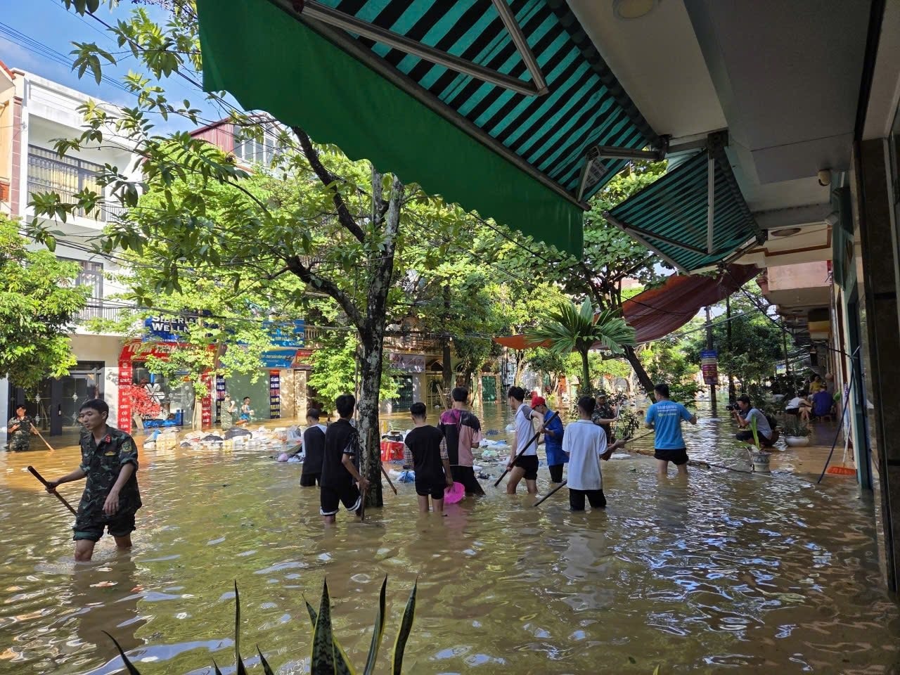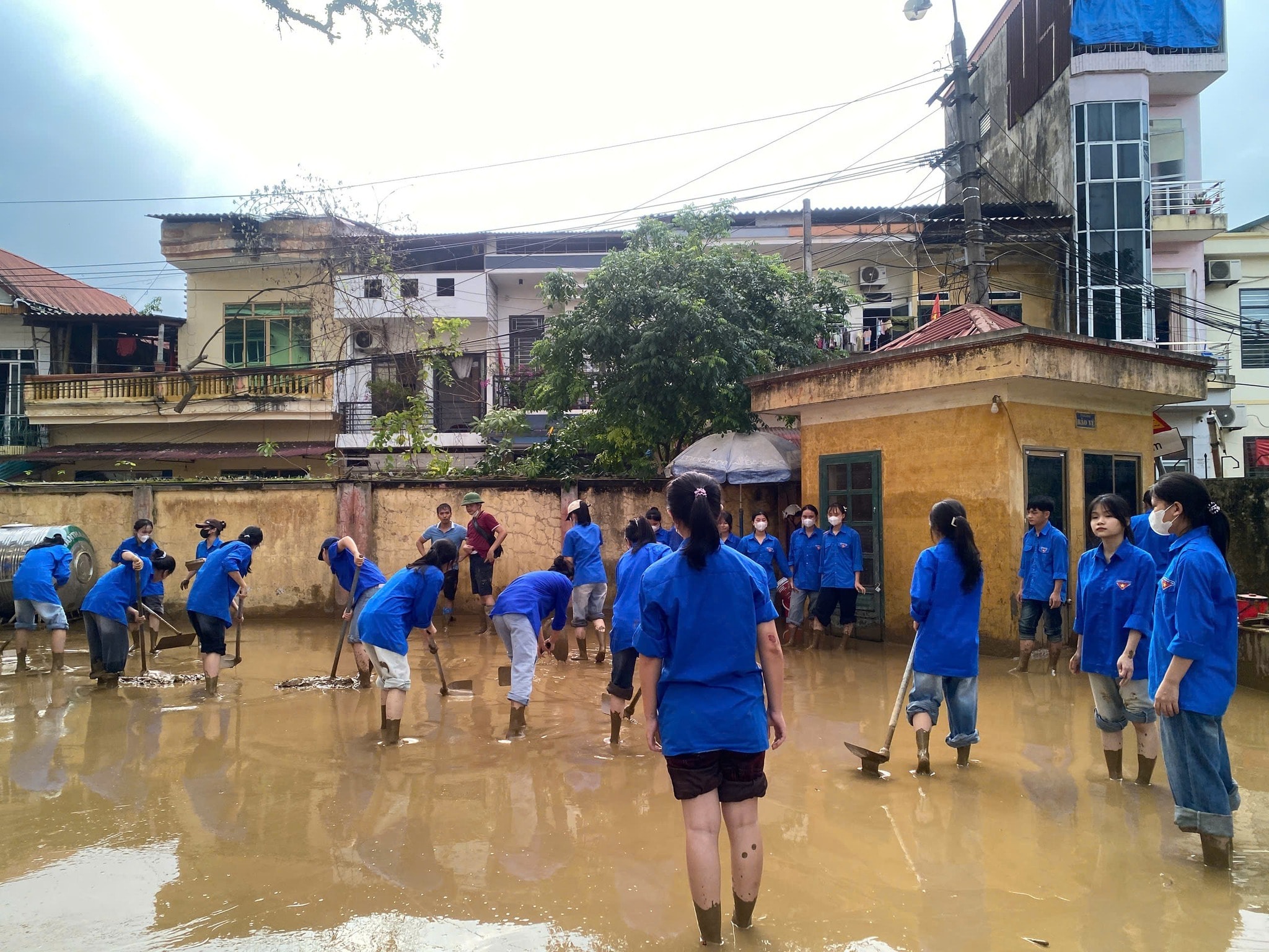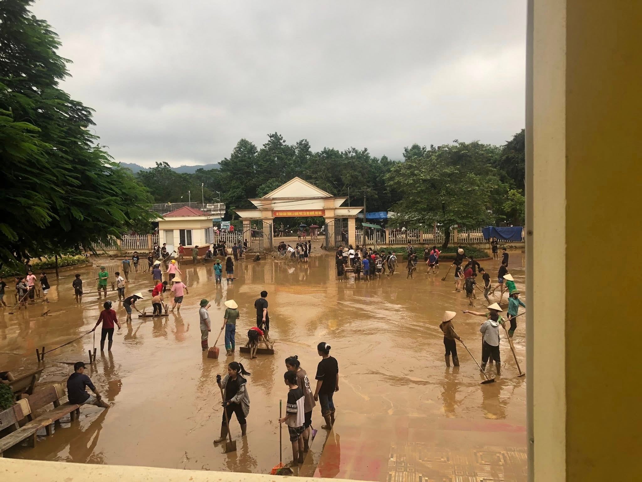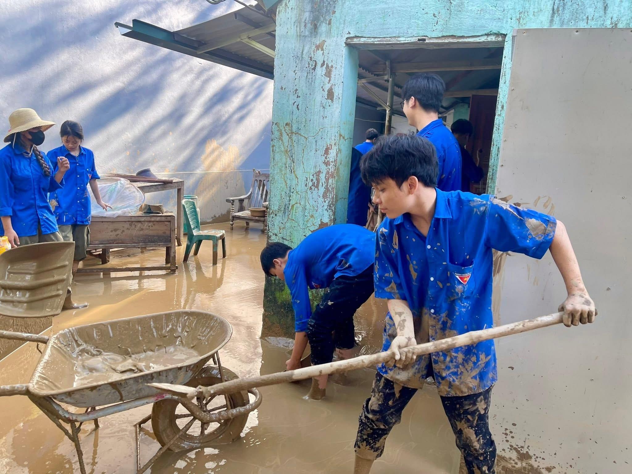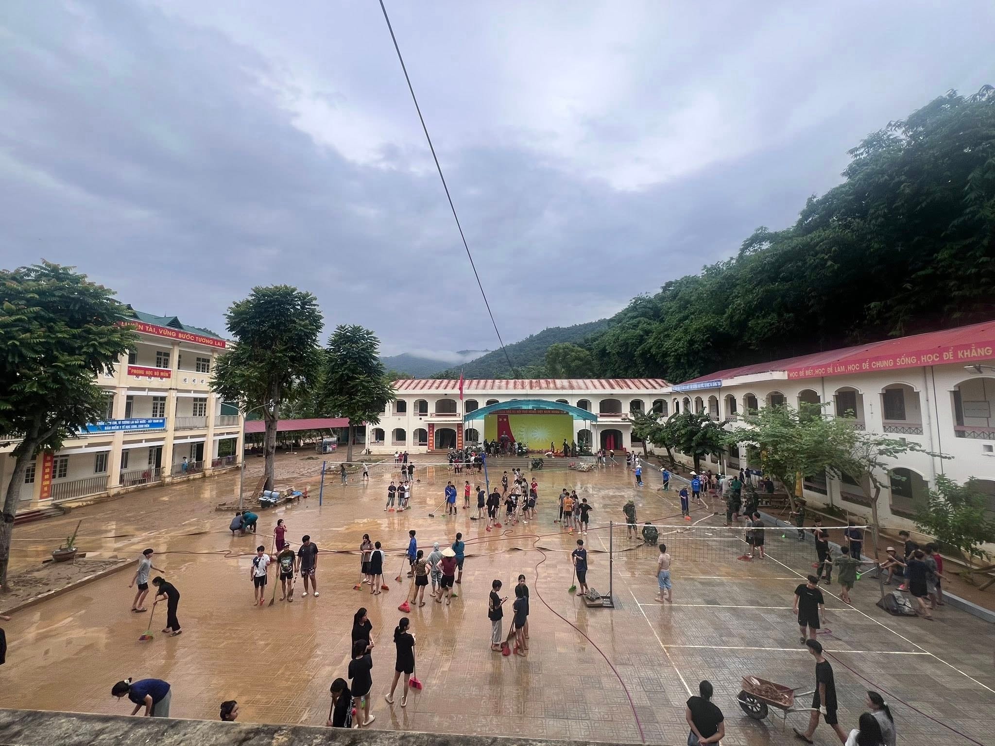 Các thầy cô giáo và các em học sinh trường THPT Nguyễn Huệ, Lào Cai tham gia hỗ trợ dọn bùn sau bão cho các trường Ảnh: Trường THPT Nguyễn Huệ, Lào Cai |