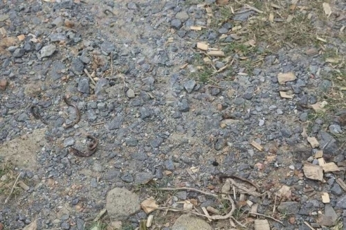 Giữa trời nắng, nhiều con giun chết và xác khô quắt lại, co rút trên đường. Trong khi đó, một số con giun ngọ nguậy yếu ớt. Việc hàng loạt giun đất trồi lên trên đường bê tông và sân vườn rồi chết khô khiến người dân bất ngờ, lo lắng không hiểu chuyện gì đã xảy ra. Ảnh: Người lao động. |