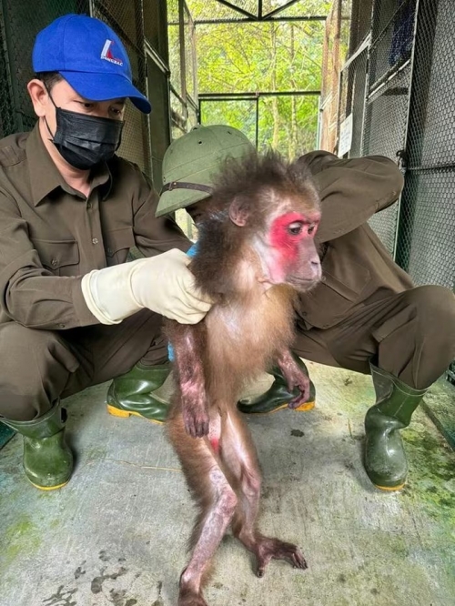 Khỉ mặt đỏ trưởng thành, nặng khoảng 5 kg, trong tình trạng suy nhược, được kiểm tra sức khỏe trước khi nuôi dưỡng trong môi trường bán hoang dã. |
