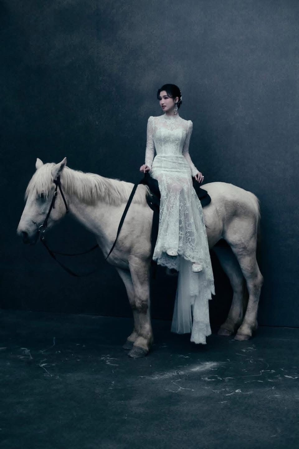 Concept thứ hai – cũng là bộ ảnh được cả hai chọn làm ảnh đại diện trên Instagram – lại theo hướng mới lạ hơn khi xuất hiện thêm một chú “bạch mã”, tạo điểm nhấn đúng trào lưu đang được chia sẻ nhiều trên mạng xã hội. Trong khung hình, Phương Nhi thể hiện nét e ấp, tươi tắn, đứng cạnh chú rể doanh nhân.