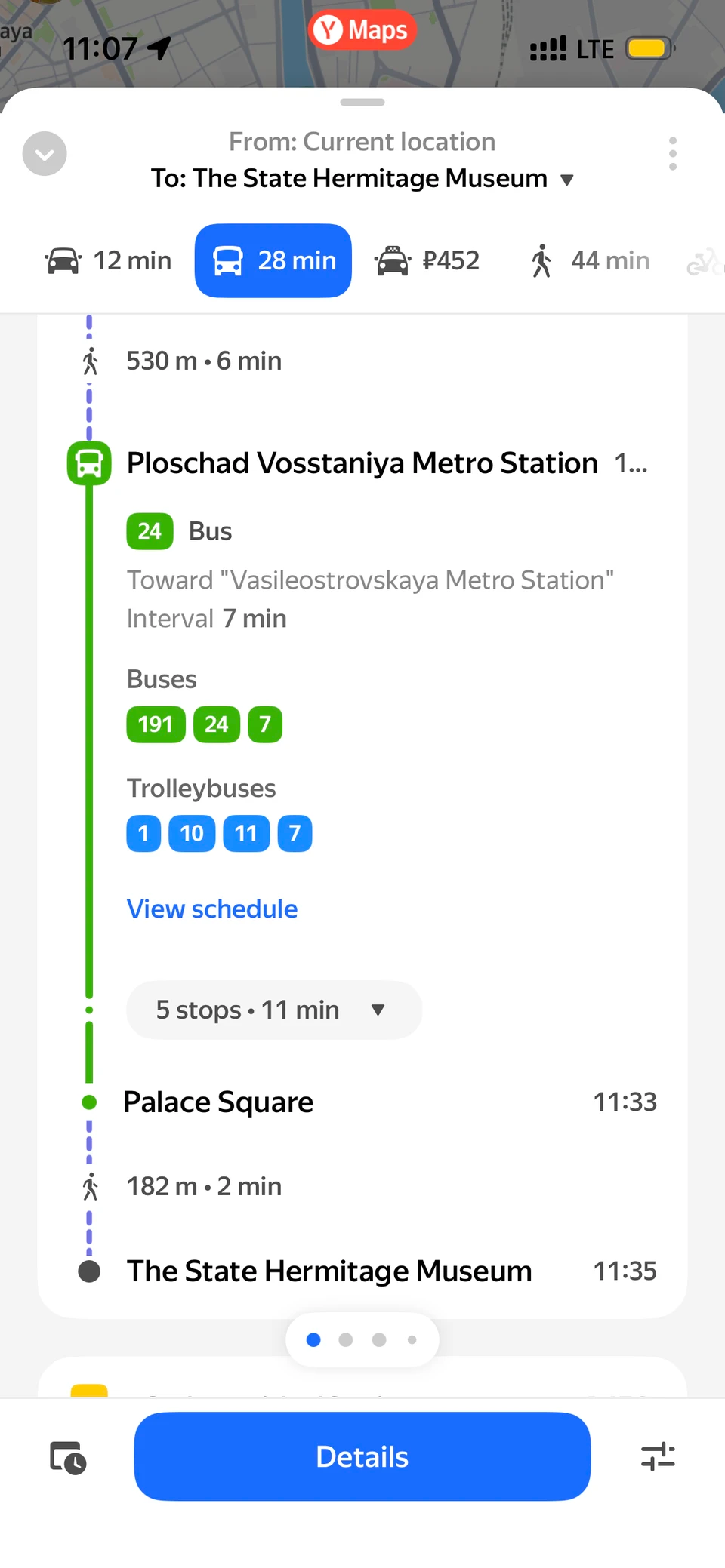 Yandex Map hiển thị các phương tiện công cộng có thể sử dụng và thời gian di chuyển tương ứng của mỗi loại xe. |