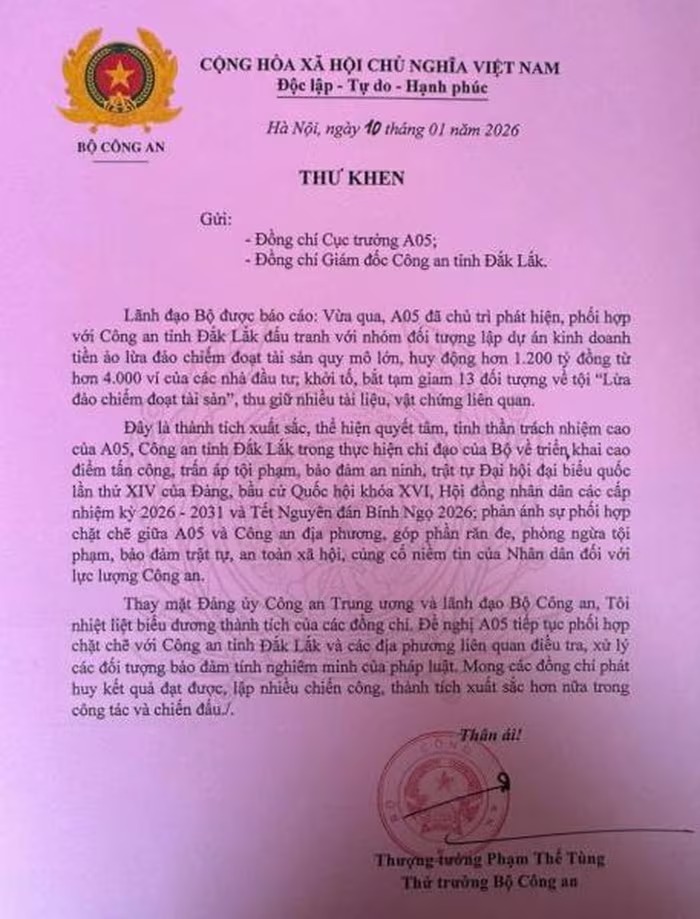 Thư khen của Thứ trưởng Thế Tùng gửi Cục trưởng Cục An ninh mạng và phòng chống tội phạm sử dụng công nghệ cao và Giám đốc Công an tỉnh Đắk Lắk. |