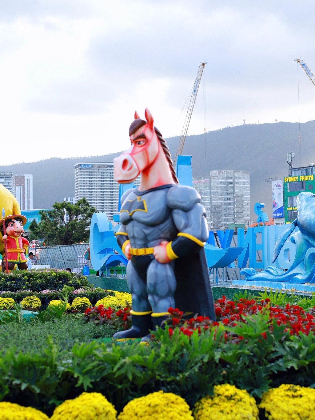 Chú ngựa cầm iPhone 17 Pro Max là một phần trong cụm linh vật với nhiều tạo hình và cảm xúc tại quảng trường Nguyễn Tất Thành. Từ dáng vẻ siêu anh hùng Batman, Superman hay hình tượng phi hành gia, mỗi linh vật mang một sắc thái khác nhau. Sự đa dạng này khiến tổng thể không bị đơn điệu.