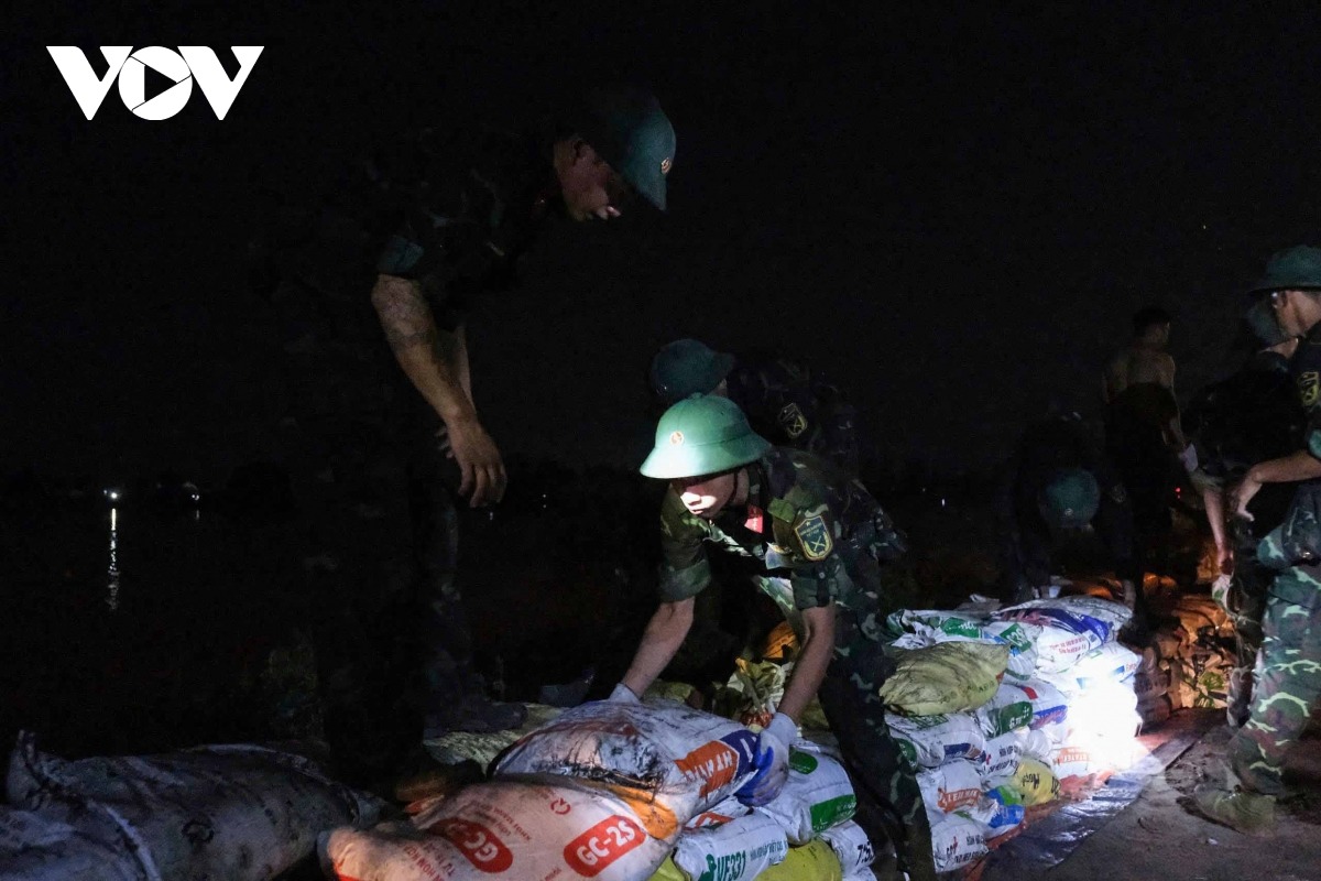Gần 2.000 người gồm lực lượng quân đội, công an, bảo vệ an ninh trật tự cơ sở cùng người dân xuyên đêm đắp cát ngăn đập tràn tại đê Đẩu Hàn, phường Kinh Bắc, tỉnh Bắc Ninh.
