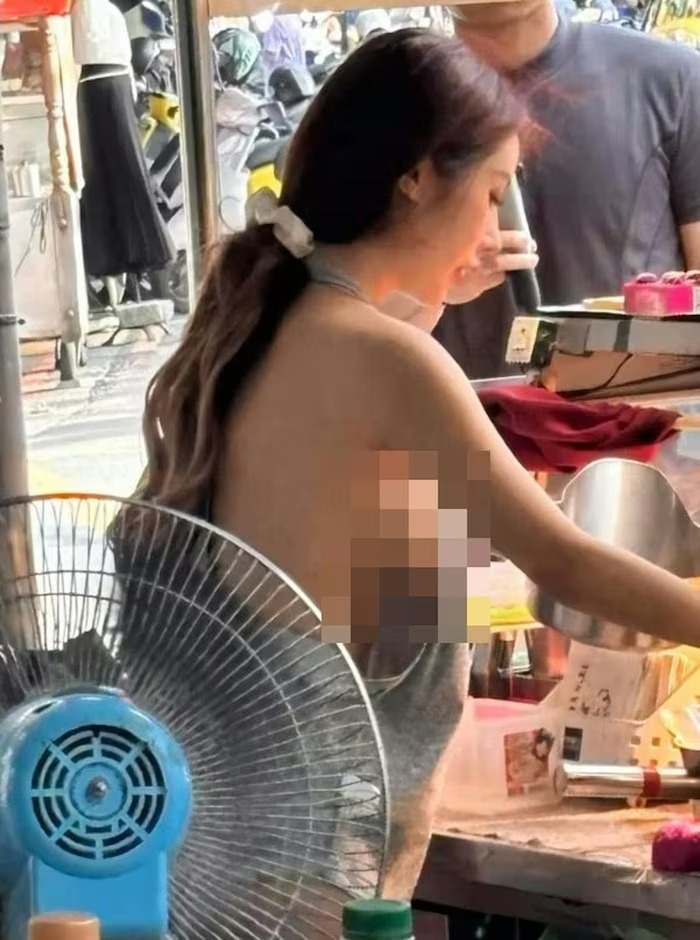 Những bức hình cho thấy cô gái trẻ chỉ mặc chiếc tạp dề mỏng, không hề có áo trong, vừa chế biến sườn chiên vừa nói chuyện với khách, một hình ảnh khiến cả khu chợ phải ngoái nhìn. |