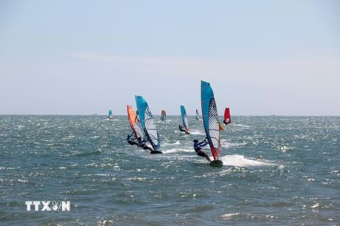 Vận động viên bức tốc về đích tại Giải Lướt ván buồm quốc tế Fun Cup 2025. (Ảnh: Nguyễn Thanh/TTXVN) |