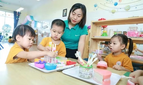 Trẻ tại Trường Mầm non An Khánh B (An Khánh, Hà Nội) trong một hoạt động góc dưới sự hướng dẫn của cô giáo. Ảnh: Đình Tuệ |