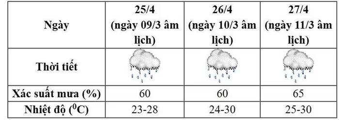 Theo Trung tâm Dự báo Khí tượng Thủy văn quốc gia, thời tiết khu vực Bắc Bộ dịp nghỉ lễ giỗ tổ Hùng Vương từ ngày 25-27/4/2026 (tức từ ngày 9-11/3 Âm lịch) nhiều mây, có mưa, mưa rào rải rác và có nơi có dông.