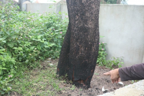 Gốc cây dương xuất hiện dấu vết cháy, chưa rõ nguyên nhân. |