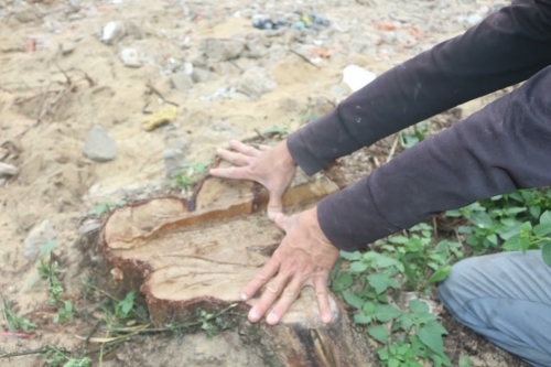 Cây dương liễu hàng chục năm tuổi bị cắt sát gốc, chỉ còn lại phần gốc trơ trọi. |